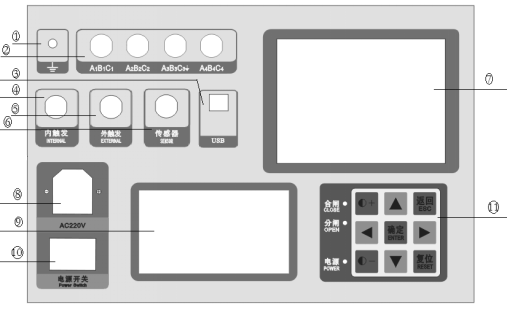 斷路器測試儀也叫高壓開關測試儀,全稱是高壓開關動特性測試儀。高壓關機性測試儀是針對各種高壓開關研制的一種通用型電腦智能化測試儀器。儀天成YTC3981斷路器動特性測試儀適用于國內外生產的所有型號的SF6開關、GIS組合電器、真空開關、油開關的機械特性試驗。超強的抗干擾能力,在500KV變電站旁路母線帶電的情況下,也能輕松試驗,精確測量。下面就此斷路器動特性測試儀的控制面板做以下的簡要說明。