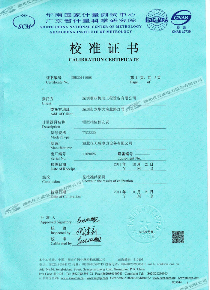 轉(zhuǎn)載:"YTC2220鉗型相位伏安表的資質(zhì)證書" 請(qǐng)注明來(lái)源于儀天成電力。 更多技術(shù)問(wèn)題請(qǐng)致電儀天成電力客戶服務(wù):027-87876585,技術(shù)部專線:027-87876585,在線客服:719388481