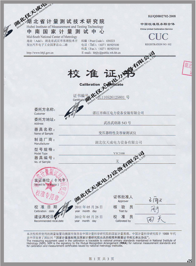 轉載:"YTC3100變壓器容量及損耗參數測試儀鑒定證書" 請注明來源于儀天成電力。 更多技術問題請致電儀天成電力客戶服務:027-87876585,技術部專線:027-87876585,在線客服:719388481