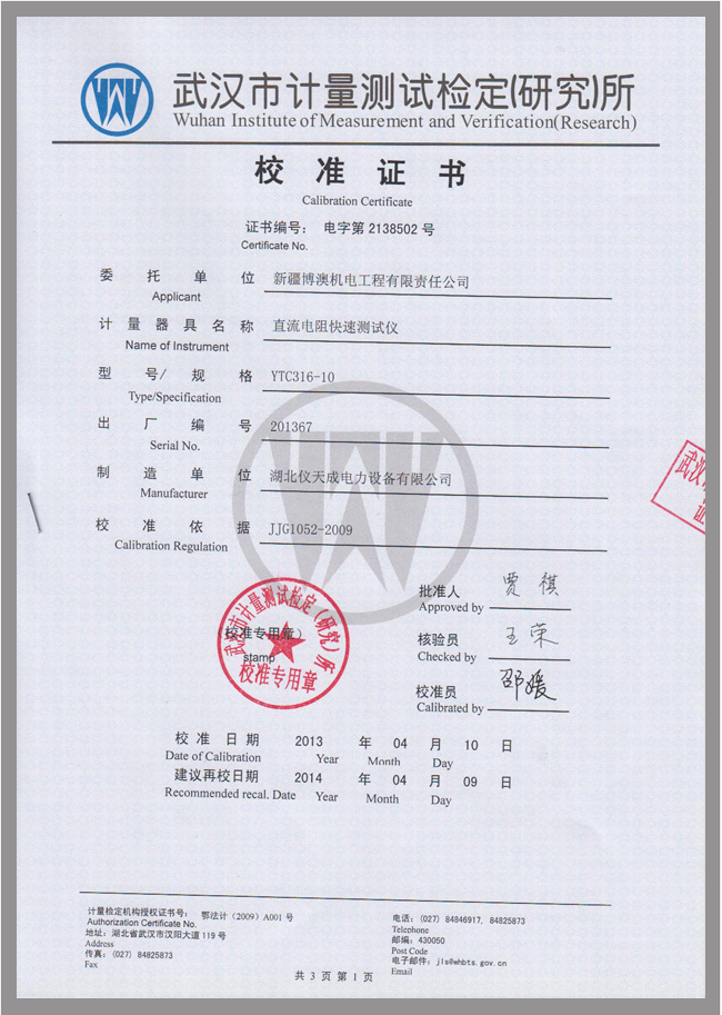 YTC316-10直流電阻測(cè)試儀鑒定證書
