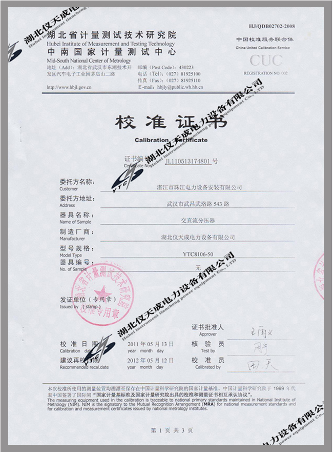 轉(zhuǎn)載:"YTC8106系列交直流分壓器鑒定證書" 請注明來源于儀天成電力。 更多技術(shù)問題請致電儀天成電力客戶服務(wù):027-87876585,技術(shù)部專線:027-87876585,在線客服: